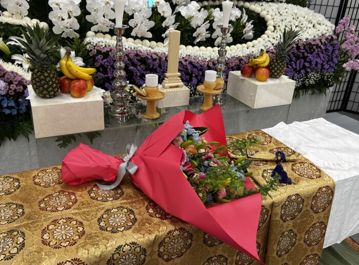お式の中で特に印象深かったのは、故人様への深い愛情が形となった副葬品と供花です。お花が大好きだったという故人様のために、長女様が自ら手作業で「棺上花」を美しく整え、心を込めて手向けられました。お棺の中には、ご家族が一つひとつ想い出を語りながら選ばれた品々が大切に納められ、故人様を慈しむ和やかで穏やかな時間が流れていました。