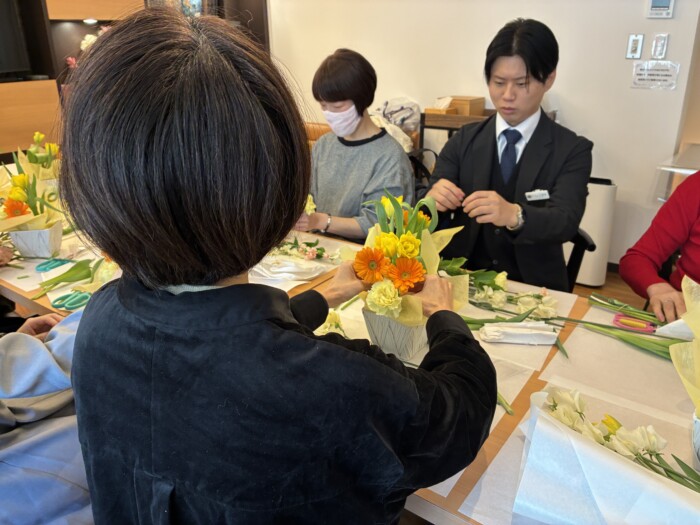 フラワーアレンジメント教室は、チューリップやスイートピーを使った、春が待ち遠しくなるような明るくて可愛らしいアレンジを、新人スタッフがなんとお客様にご指導いただきながら(笑)作っておりました😮