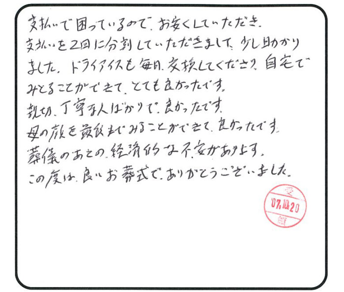 少し助かりました。ドライアイスも毎日、交換してくださり、自宅でみとることができて、とても良かったです。