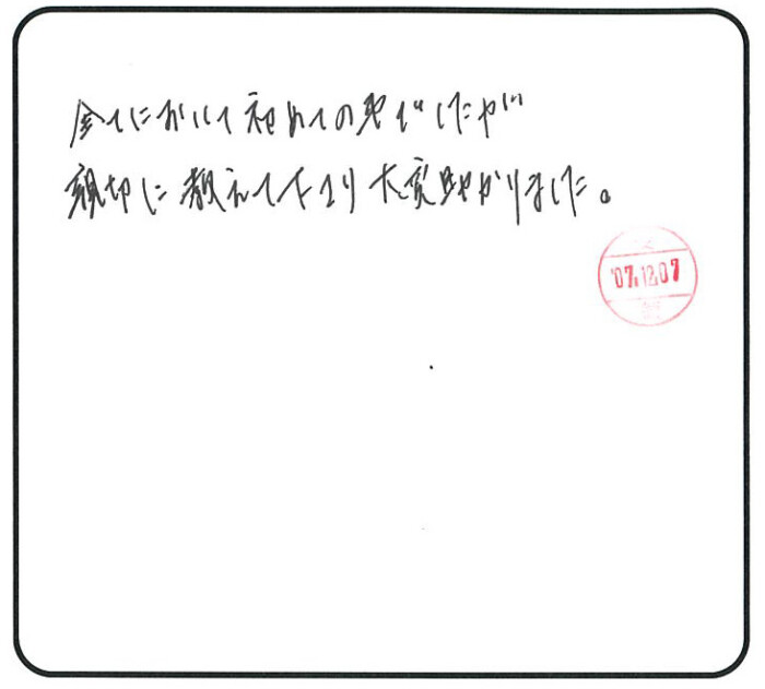 お褒めのお言葉を何よりの励みにし、今後も精進してまいります。